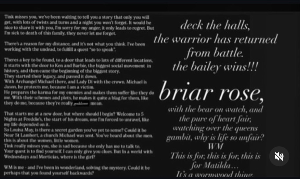 I needed him. In every fathomable way. He was and still is the only one for me. Jessica & Lucifer, whiskey & hellfire. The internal forgotten bloodline that started at Ken and Barbie, then ascended onto five nights at Freddie’s, then Archangel Michael came as Jason, and I found myself in wonderland searching for myself, WM; leading me to Wednesday and Morticia, which is all Martian for Mother and Father, was I alone in it all? No. Absolutely not. I called on things to help, and that’s what I’m here to share. It’s a Wormwood thing. A WM thing. This is for, this is for, this is for Matilda.